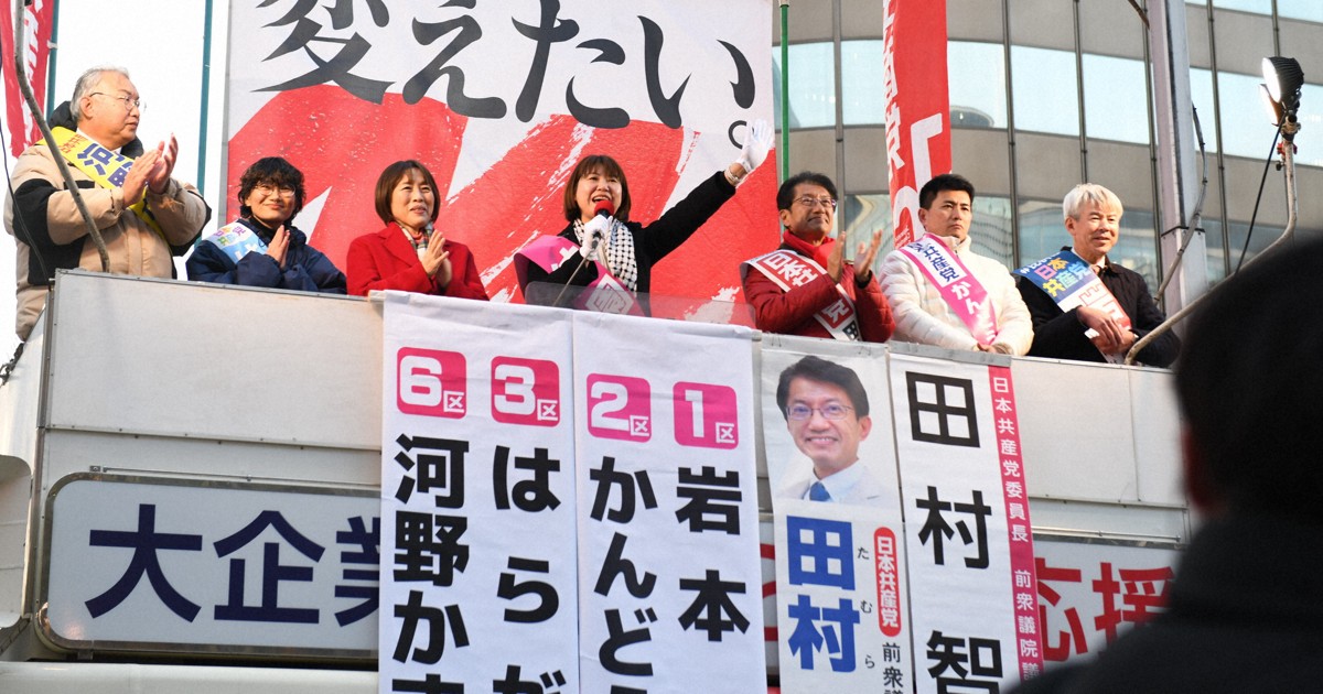 | 19位 | ![]() | 1,000 | 「高市政権に立ち向かう」 共産委員長とれいわ候補が共同演説 福岡 | 毎日新聞 (02月04日) 3日夕にJR博多駅(福岡市博多区)前であった共産党の田村智子委員長の衆院選街頭演説には、福岡8区から立候補したれいわ新選組の新人、沖園理恵氏(51) [mainichi.jp] |