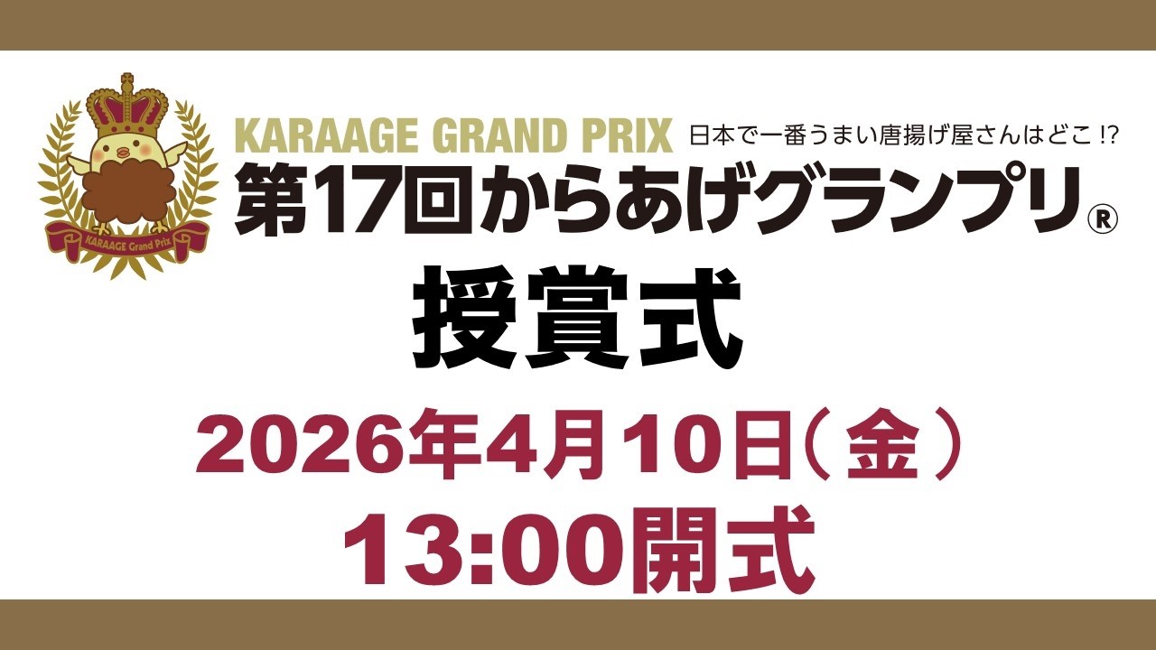 | 1位 | ![]() | 20,265 | 第17回からあげグランプリ®授賞式 - YouTube (04月10日) 第17回からあげグランプリ®授賞式 2026年4月10日(金)13:00START からあげグランプリ®とは。。。。唐揚げが一番好きで唐揚げを食べると [youtube.com] |