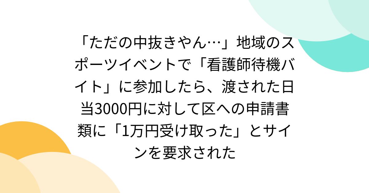 | 21位 | ![]() | 189 | 「ただの中抜きやん…」地域のスポーツイベントで「看護師待機バイト」に参加したら、渡された日当3000円に対して区への申請書類に「1万円受け取った」とサインを要求された - Togetter [トゥギャッター] (04月26日) モヤモヤ吐き出し ・地域のスポーツイベントに看護師待機バイトを依頼され参加。 ・当日渡された日当は3000円。 ・区に申請する書類に「1万円受け取りました」のサインをするように要求される。 ・受け取ってない金額のサインはできませんと断る 区役所の顔見知りの方に相談してきました。 |