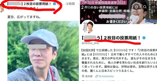 | 20位 | 786 | 【セーフかアウトか!?】参院選投票日当日、公職選挙法129条ギリギリを攻める有名候補者さんが物議 | もえるあじあ(・∀・) (07月20日) 特定の選挙の当日に特定の候補者名とともに「2枚目の投票用紙!」と投票を促す行為は公職選挙法129条に違反するのではないだろうか。 都知事選の事前運動も何もならなかったしやったもん勝ちはよくない本日の朝… [moeasia.net] | |