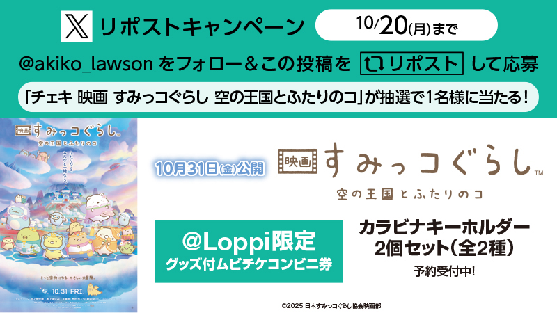 31位 | ![]() | 5,356 | 『映画 すみっコぐらし 空の王国とふたりのコ』公開記念 フォロー&リポストキャンペーン!|ローソン公式サイト (10月14日) コンビニエンスストア「ローソン」の最新情報をお届けするローソン研究所ブログです [lawson.co.jp] |