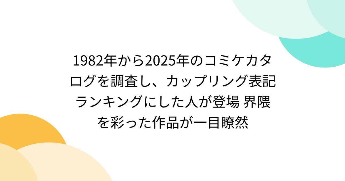 | 17位 | ![]()  | 185 | 1982年から2025年のコミケカタログを調査し、カップリング表記ランキングにした人が登場 界隈を彩った作品が一目瞭然 - Togetter (10月25日) ついに全コミケカタログのカップリング表記調査が終わったので、 全コミケカタログ(SP除く)の全サークルカット(約200万枚)から目視でカップリング表記を抽出して集計した「カップリング表記ランキング」をBar chart race(動くグラフ)にしてみました。 素晴らしいデータ 労  |