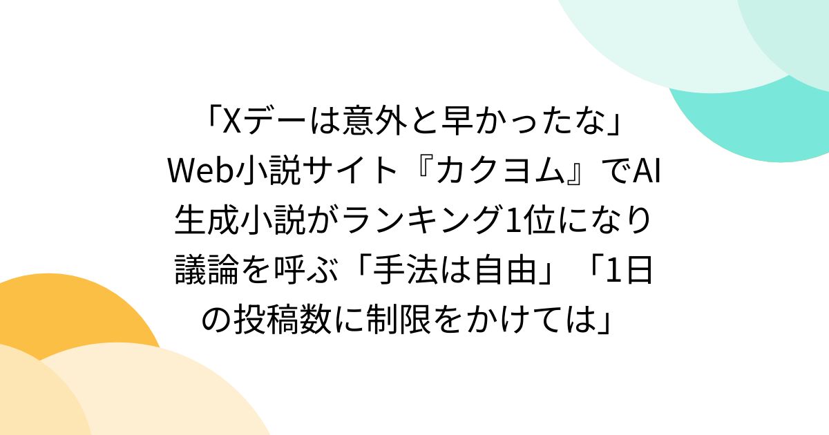 | 14位 | ![]()  | 187 | 「Xデーは意外と早かったな」Web小説サイト『カクヨム』でAI生成小説がランキング1位になり議論を呼ぶ「手法は自由」「1日の投稿数に制限をかけては」 - Togetter (10月29日) カクヨムのランキングでAI生成小説が1位になり波紋が広がっている。AIを誘導しテンプレ構成で数値を狙う手法が有効で、人間の創作技術と必ずしも一致しない。評価は表現内容が重要で、手法に制約がなければ自由に扱える。不公平なら評価基準を明確化すべきだ。 [togetter.com]  |