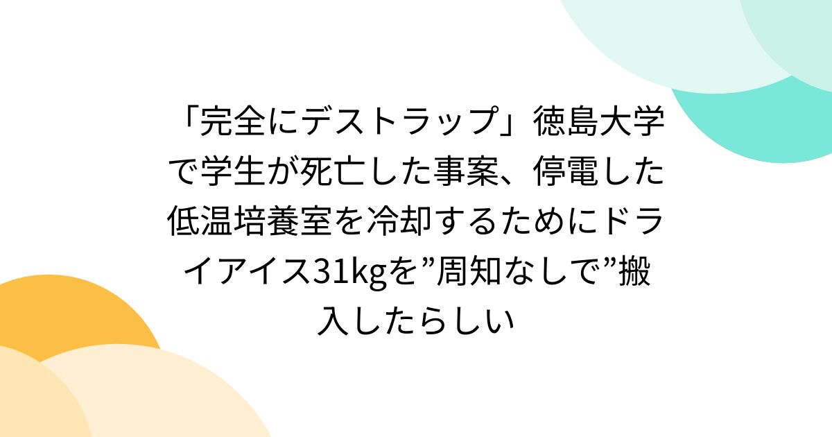 | 26位 | ![]()  | 112 | 「完全にデストラップ」徳島大学で学生が死亡した事案、停電した低温培養室を冷却するためにドライアイス31kgを”周知なしで”搬入したらしい - Togetter (10月29日) 徳島大学で停電した低温培養室に別の研究室が周知せずドライアイス31kgを搬入し、その後学生が死亡した。高濃度CO2の吸入は即時の失神や呼吸停止、血液のアシドーシスや多臓器不全を引き起こすため危険性は高い。搬入判断が共有されず共用空間の安全管理と衛生教育が欠如していた点が問題で、周  |