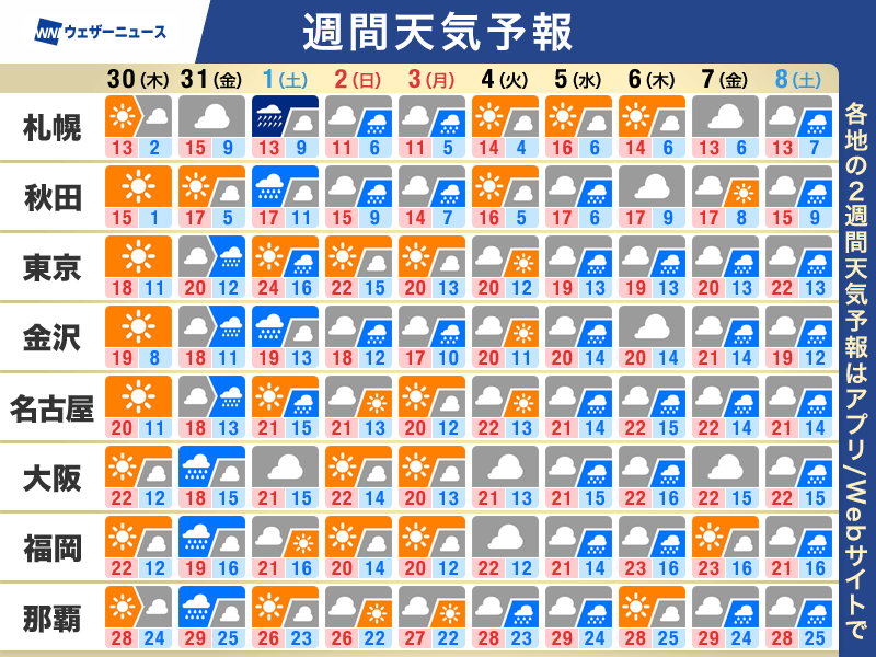 | 12位 | ![]()  | 795 | 明日10月30日(木)の天気予報 全国的に晴れる所が多い 朝と昼間の気温差大 - ウェザーニュース (10月29日) 明日30日(木)は冬型の気圧配置が弱まり、日本列島は高気圧に覆われます。穏やかに晴れる所が多くなりそうです。朝と昼間の気温差が大きくなります。 [weathernews.jp]  |