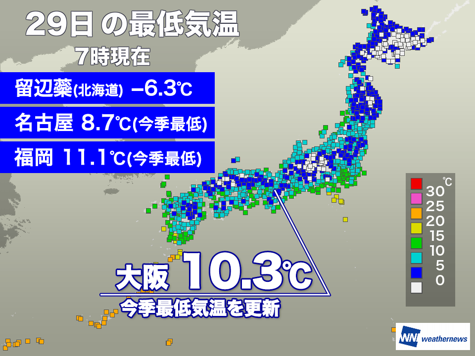 | 27位 | ![]()  | 357 | 冷え込んだ朝 名古屋や大阪など今季一番の寒さに - ウェザーニュース (10月29日) 今日10月29日(水)は、各地で朝の冷え込みが強まりました。大阪や名古屋、福岡など西日本を中心に今季一番の冷え込みとなったところが多くなっています。東京でも八王子市で8.8℃を観測し、今季最低となっています。 [weathernews.jp]  |