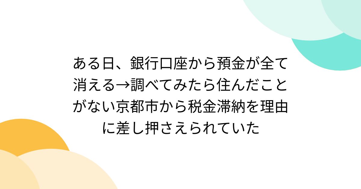| 12位 | ![]()  | 301 | ある日、銀行口座から預金が全て消える→調べてみたら住んだことがない京都市から税金滞納を理由に差し押さえられていた - Togetter (10月31日) 銀行口座の預金が全額差押えられ、調査で京都市納税課からの指示と判明。居住歴はなく同姓同名の誤差押えと判明して返金約束を受けたが、管理と対応の杜撰さに憤り。生活資金や事業用口座への影響、損害賠償や慰謝料請求の可否が問題となる。 [togetter.com]  |