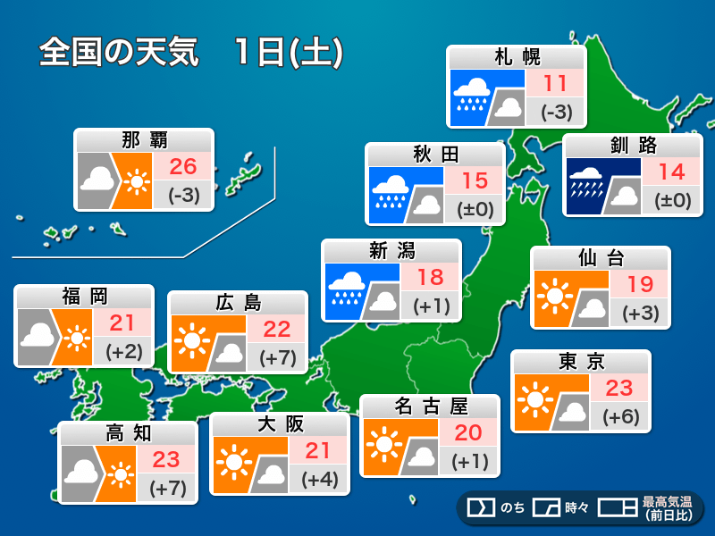 | 5位 | ![]()  | 977 | 今日11月1日(土)の天気予報 三連休初日は北日本で荒天 関東以西は天気回復 - ウェザーニュース (11月01日) 11月スタートとなる今日1日(土)は急発達する低気圧の影響で、北日本は雨や風が強まります。関東から西日本は天気が回復し、日中は気温が上がる見込みです。 [weathernews.jp]  |