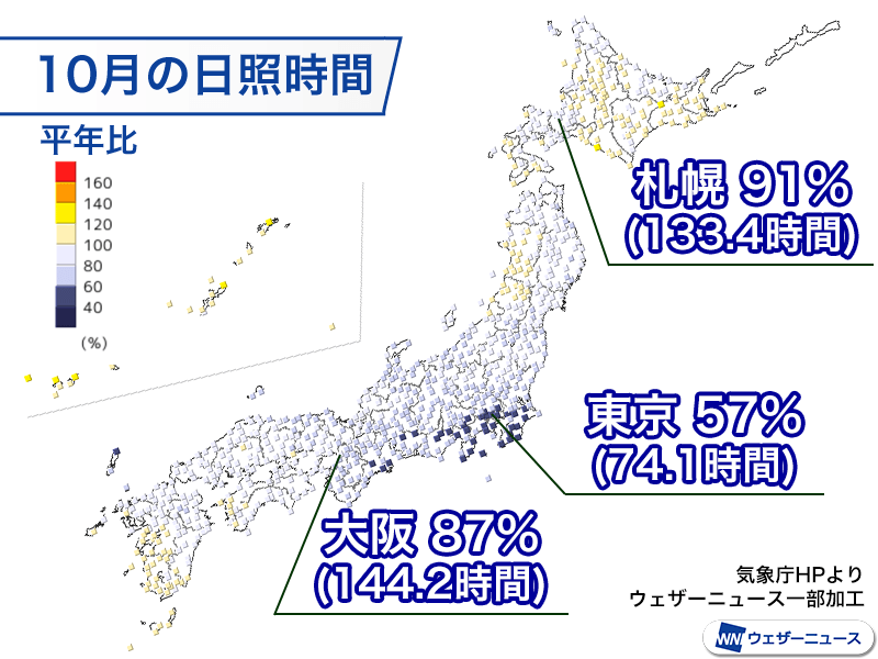 | 16位 | ![]()  | 455 | 10月は東京の日照時間が平年の6割 日本の平均気温は過去2番目の高さ - ウェザーニュース (11月01日) 10月は日照時間が平年よりも少ない所が多く、特に東京都心など関東南部は平年の6割未満となりました。気温は上旬から中旬の高温傾向を反映して、過去2番目の [weathernews.jp]  |