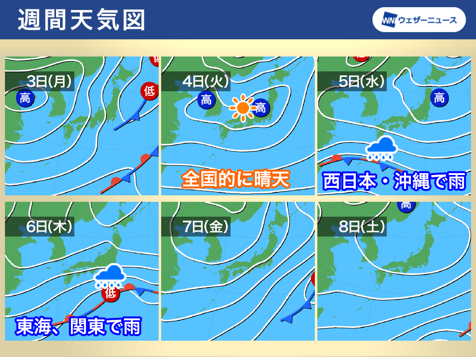 | 27位 | ![]()  | 284 | 週間天気予報 連休中は広く秋晴れ 週中頃は雨や曇りに - ウェザーニュース (11月01日) この先の天気のポイントは「連休中は北日本や北陸で荒天のおそれ」「週中頃は西日本や東日本で雨の所も」「寒暖差に注意、体調管理を」です。ウェザーニュースの最新の天気予報を随時確認してください。 [weathernews.jp]  |