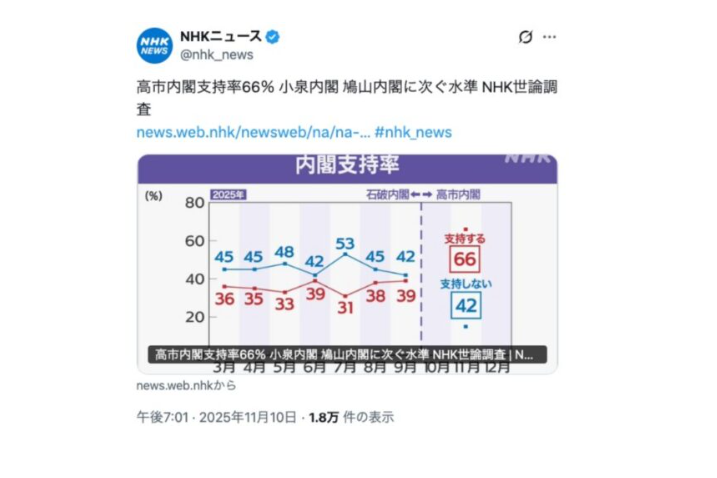 | 6位 | ![]() | 535 | 【NHK世論調査】高市内閣支持率 支持する66% 支持しない42%→「合計で100%超えとるやないかい!w」「劣化と偏向がエゲツナイレベル」 (11月11日) 画像出典:Tokyo.Tweetさんの投稿より(NHKのX投稿) 以下,Xより 【Tokyo.Tweetさんの [japannewsnavi.com] |