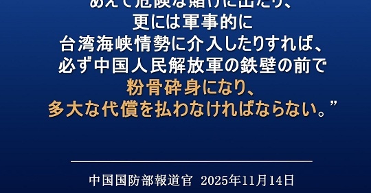 | 10位 | ![]() | 602 | 中国外交部、国防省が高市首相の「台湾有事」を巡る発言に日本語で異例の警告文を発するが「中国外交部ジェネレーター」を作られXで大喜利のネタにさ (11月15日) 中国外交部と国防省が高市首相の「台湾有事」発言に強い警告を出したが、日本語の文面が大仰で対象不明瞭と受け取られ、X上で「中国外交部ジェネレーター」とし [togetter.com] |