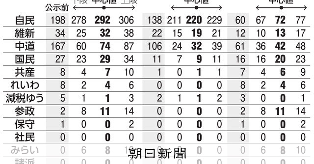 | 27位 | ![]() | 662 | 自維、300議席超うかがう 中道ふるわず半減も 衆院選中盤情勢調査 [衆院選(衆議院選挙)2026]:朝日新聞 (02月02日) 8日投開票の衆院選(定数465)について、朝日新聞社は1月31日から1日にかけ、約37万人を対象に電話とネットによる調査を実施し、取材情報も加えて中盤情勢を探った。(1)自民党は単独で過半数(233… [asahi.com] |