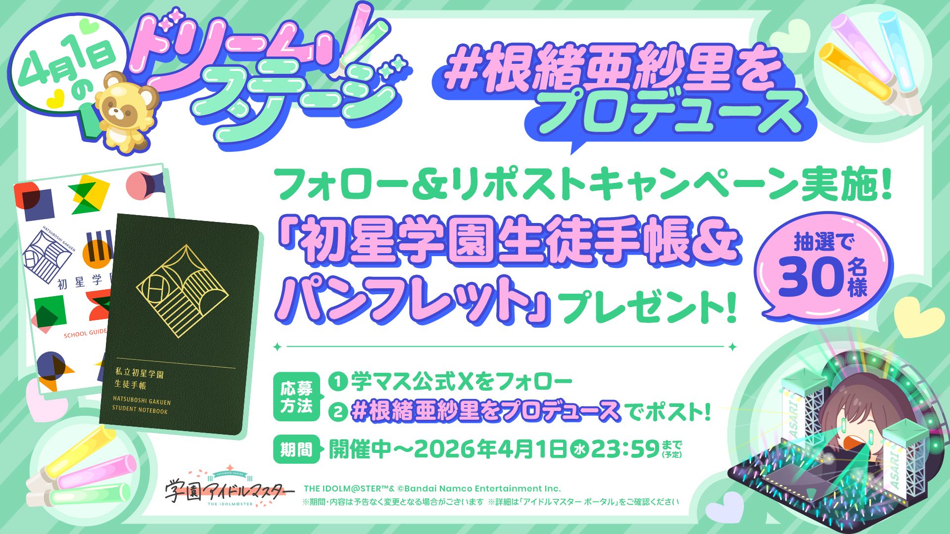 | 70位 | ![]() | 5,526 | 【学マス】「#根緒亜紗里をプロデュース」エイプリルフール記念!初星学園生徒手帳&パンフレットセットプレゼントキャンペーン! | 【公式】アイドルマスター ポータル(アイマス) (04月01日) プロデューサーのみなさん、こんばんは! 「学園アイドルマスター」からお知らせです!「#根緒亜紗里をプロデュース」エイプリルフール記念! 初星学園生徒手帳&パンフレットセットプレゼント! エイプリルフール企画「#根緒亜紗里をプロデュース」を記 [idolmaster-officia |