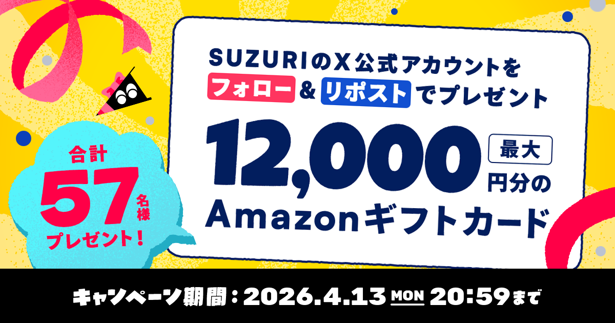 | 44位 | ![]() | 4,634 | セール同時開催キャンペーン!最大12,000円分のAmazonギフトカードをプレゼント🎁 | それゆけ!SUZURI計画 (04月03日) SUZURIのブラックフライデー開催期間中、Xフォロー&リポストキャンペーンを実施します。合計50名様に、最大5,000円のAmazonギフトコードを [suzuri.jp] |
