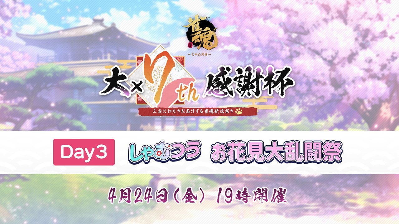 | 4位 | ![]() | 10,434 | 【雀魂大大大大大大大感謝杯7th】しゃむつうお花見大乱闘祭 - YouTube (04月23日) しゃむつうお花見大乱闘祭雀魂7周年を記念して開催する恒例の周年大会今回は、にじたま、ぐみひゃく、しゃむつう3番組の合同企画!それぞれの番組の威信をかけた大会戦です。出場選手は「じゃんチーム」「たまチーム」に分かれて戦います。チームの勝敗は、3日間の各チームの素点を合計した総合スコ |