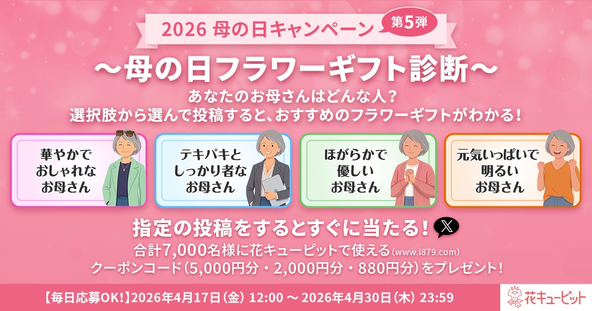 | 75位 | ![]() | 2,984 | 花キューピットの母の日キャンペーン第5弾~母の日フラワーギフト診断~|フラワーギフト通販なら花キューピット (04月23日) キャンペーン投稿内にある選択肢から選んで投稿をすると当たる! [i879.com] |