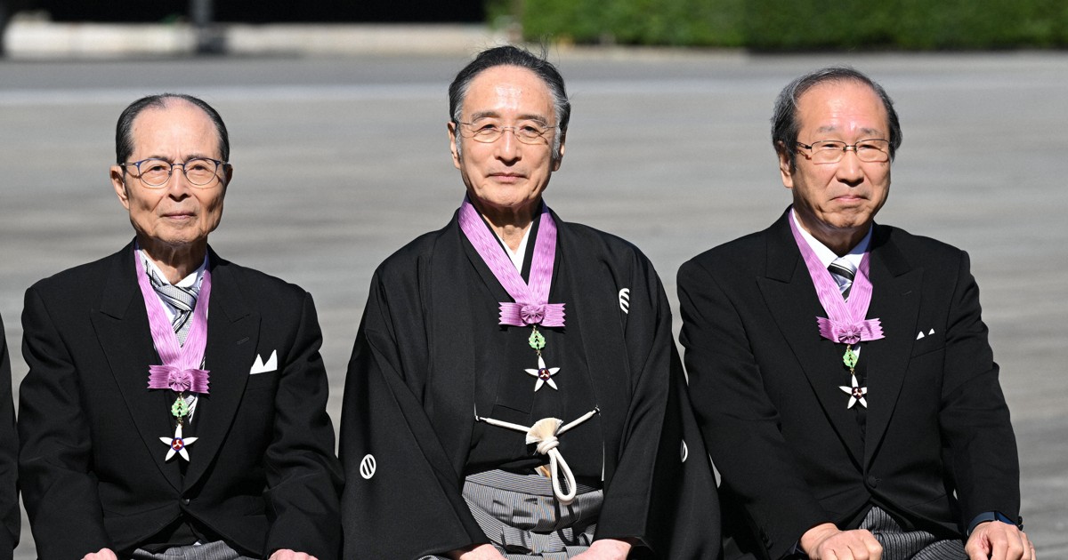 文化勲章授与式後、記念写真に納まる(左から)王貞治さん、片岡仁左衛門さん、北川進さん=皇居・宮殿東庭で2025年11月3日、平川義之撮影 [mainichi.jp]