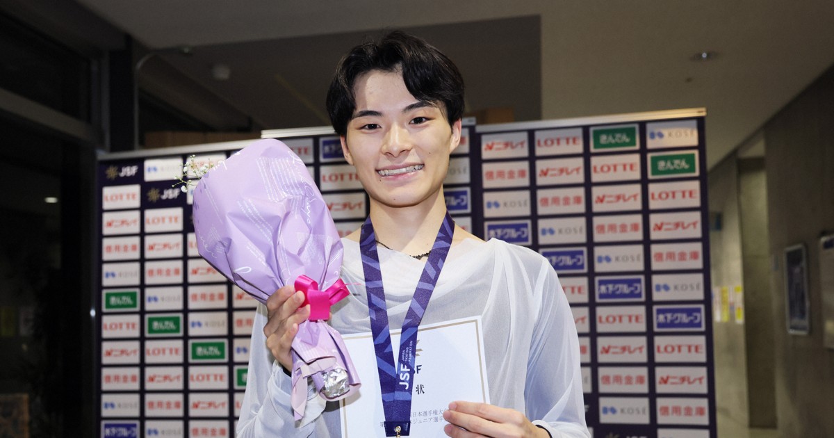メダルを胸に笑顔を見せる男子1位の杉山匠海=大津市の木下カンセーアイスアリーナで2025年11月3日、吉田航太撮影 [mainichi.jp]